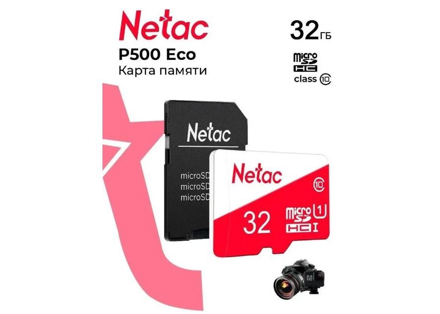 Карта памяти MicroSDHC Netac 32Гб P500 (NT02P500STN-032G-R) UHS-I U1Class 10 переходник SD