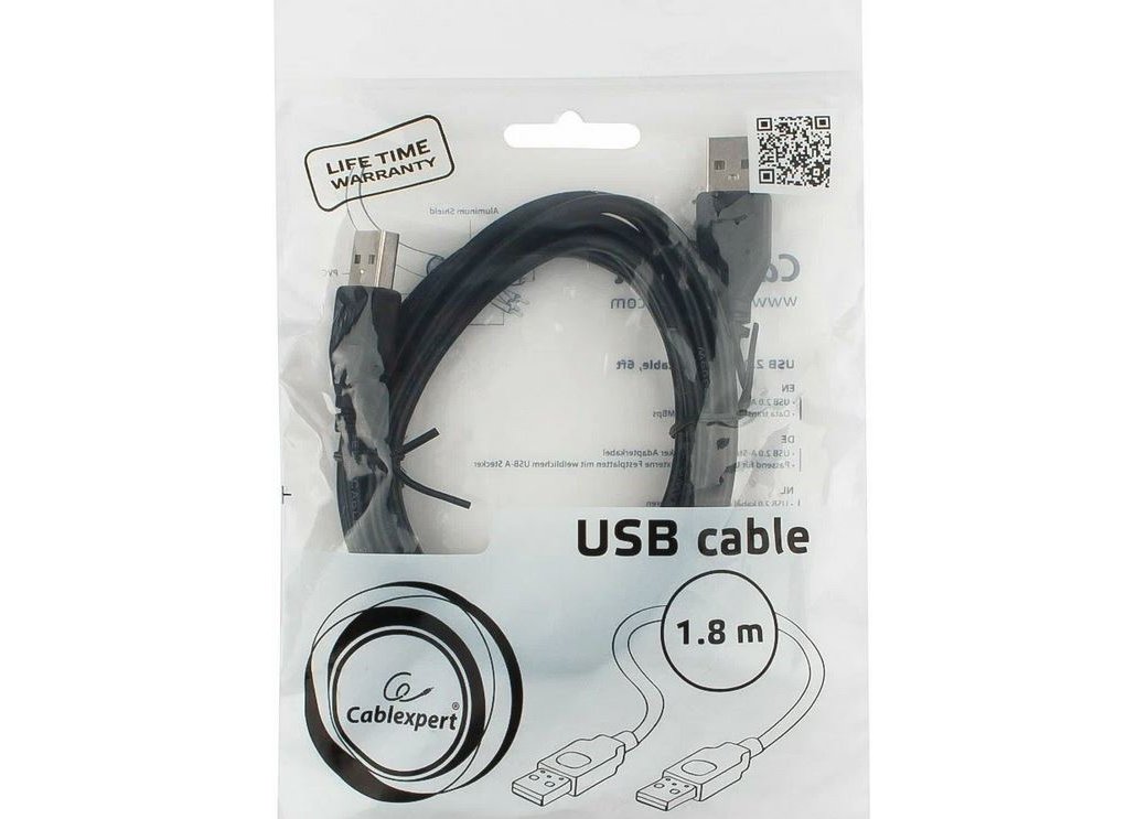 | Экранированный USB Type A [папа] - [папа] кабель длиной 1.8 м Тип кабеля: Type A. Версия USB: 2.0. Скорость передачи данных: до 480 Мбит/сек. Экранирование: двойное (фольга + сетка). Разъёмы: 2 х USB Type A [папа]. Макс. сила тока: 2.4 А. Толщина жил (передача данных / питание): 28 / 26 AWG. Длина: 1.8 м. |