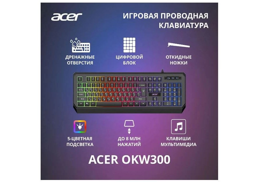 | Описание | Модель: OKW300, Бренд: ACER, Интерфейс: USB, Тип соединения: проводная, Длина кабеля: 1.8 м, Подсветка клавиш: есть, Тип подсветки: Rainbow, Для геймеров: да, Доступ к горячим клавишам мультимедиа: Одно касание для доступа к 12 функциям мультимедиа и Интернета с помощью клавиш FN+ от F1 до F12. Обычная/тонкая: обычная, Цвет: черный, Размеры клавиатуры (ШхВхТ): 465 х 171 х 35 мм, Габариты упаковки (ед) ДхШхВ: 0.48x0.193x0.04 м, Вес упаковки (ед): 0.85 кг |