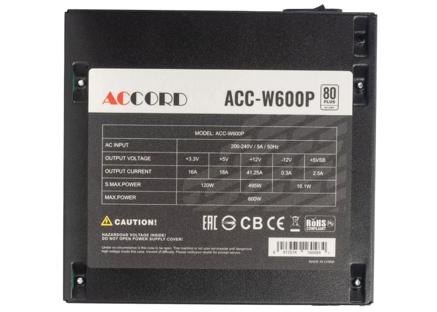 | Описание | Бренд: ACCORD, Модель: ACC-W600P, Форм-фактор: ATX, Версия ATX: 12V v2.4, Производительность (КПД): 80 %, Сертифицирован в стандарте: 80 PLUS WHITE, Тип системы охлаждения: активная, Минимальное входное напряжение: 200 В, Максимальное входное напряжение: 240 В, Цвет: черный, Питание процессора: 4+4 pin, Питание материнской платы: 20+4 pin, Длина линий питания МП: 500 мм, Длина линий питания видеокарты: 550 мм, Длина линий питания процессора: 600 мм, Питание видеокарты: 2х(6+2) pin, Разъемы Peripheral (Molex): 2 шт, Разъемы SATA: 6 шт, Размер вентилятора(ов): 120мм, Количество вентиляторов: один, Сетевой кабель: отсутствует, Защита от коротких замыканий (SCP): есть, Защита от повышения напряжения (OVP): Защита от повышения напряжения (OVP): есть, Защита от понижения напряжения (UVP): есть, Другие функции защиты: OPP |