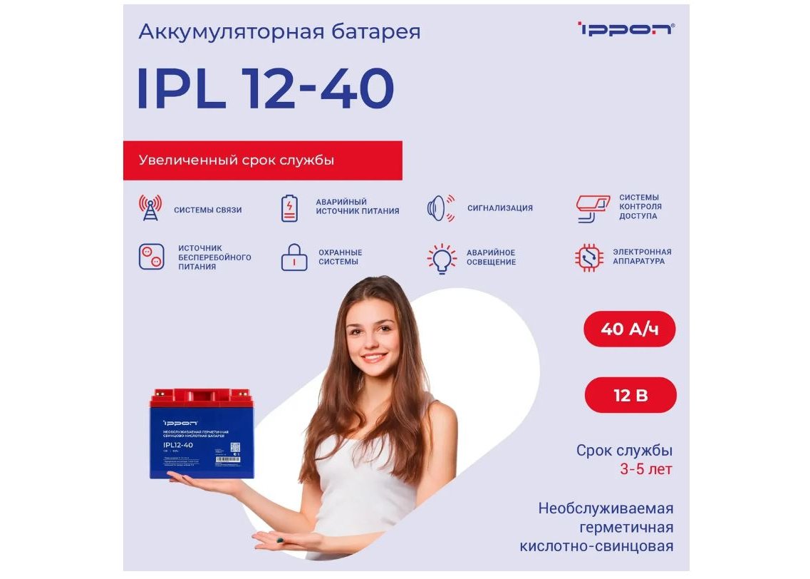 | Бренд: IPPON. Модель: IPL12-40. Напряжение питания: 12 В. Емкость: 40 Ач. Клеммы: M6. Температура зарядки: От-12 до +40 °С. Температура разрядки: О -15 до +50 °С. Внутреннее сопротивление: около 9 МОм. Максимальный ток разрядки: 5 c - 400 A. Материал корпуса: ABS. Саморазрядка: Батареи Ippon разрешается хранить без подзарядки не более 6 месяцев при температуре 25 C. При повышении температуры срок хранения без подзарядки уменьшается. Требования: Влияние температуры на емкость 40 C 103%, 25 C 100%, 0 C 86%. Температура хранения: От -15 до +40 °С. Температура окружающей среды: 25+/-3 °С. Размеры (ШхВхГ): 97 х 170 х 255 мм. Высота с клеммами: 170+/-2 мм. Габариты упаковки (ед) ДхШхВ: 0.215x0.178x0.19 м. Вес товара: 13.7 кг. |