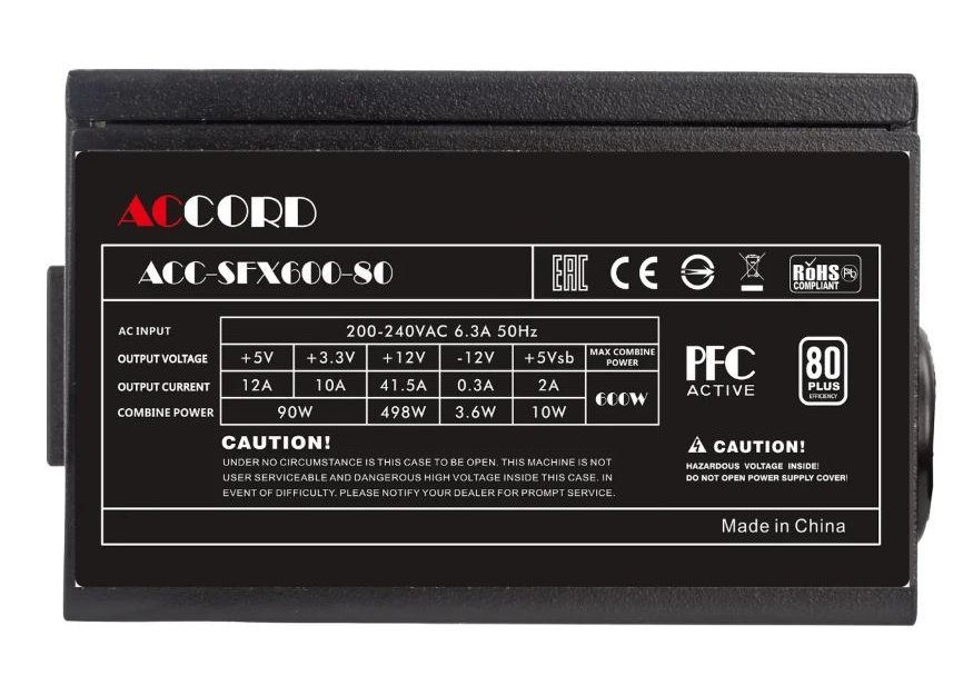 | Описание | Бренд: ACCORD, Модель: ACC-SFX600-80, Форм-фактор: SFX, Версия ATX: 12V v2.31, Активный PFC: есть, Цвет: черный, Питание процессора: 4+4 pin, Питание материнской платы: 24 pin, Питание видеокарты: 6+2 pin, Разъемы Peripheral (Molex): 2 шт, Разъемы SATA: 3 шт, Размер вентилятора(ов): 80мм, Количество вентиляторов: один, Сетевой кабель: в комплекте |