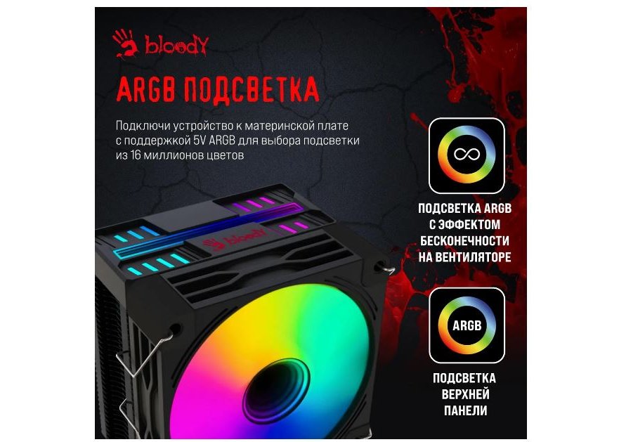 | Описание | Бренд: BLOODY, Модель: BD-AC150-ARGB1, Тип охлаждения: активное воздушное, Назначение кулера для бренда: AMD/Intel, Количество вентиляторов: 1, Направление выдува: параллельно МП, Тип подшипника: гидродинамический, Hydro Dynamic, Срок службы вентилятора: 60000 ч, Предназначено для ЦП: да, Актуальный разъем: AM5/AM4/1200/1700/1851, Совместимость Socket 2011: да, Совместимость Socket 1156: да, Совместимость Socket 1155: да, Совместимость Socket 1151: да, Совместимость Socket 1150: да, Совместимость Socket 1200: да, Совместимость Socket 1700: да, Совместимость Socket 1851: да, Совместимость SocketAM4: да, Совместимость Socket 2011-v3: да, Совместимость Socket 1366: да, Совместимость SocketAM5: да, Совместимость Socket 2066: да, Максимальное тепловыделение процессора: 150 Вт, Тип крепления к материнской плате: на винтах, Использование тепловых трубок: с тепловыми трубками, Тепловые трубки: 4 шт, Материал радиатора: алюминий+медь, Подсветка: есть, Цвет подсветки: многоцветная, Тип подсветки: ARGB, Термопаста в комплекте: есть, ЖК дисплей: есть, Особенности: ARGB подсветка вентилятора и верхней панели, Вес: 365 грамм, Разборное крепление: да, Цвет: черный |