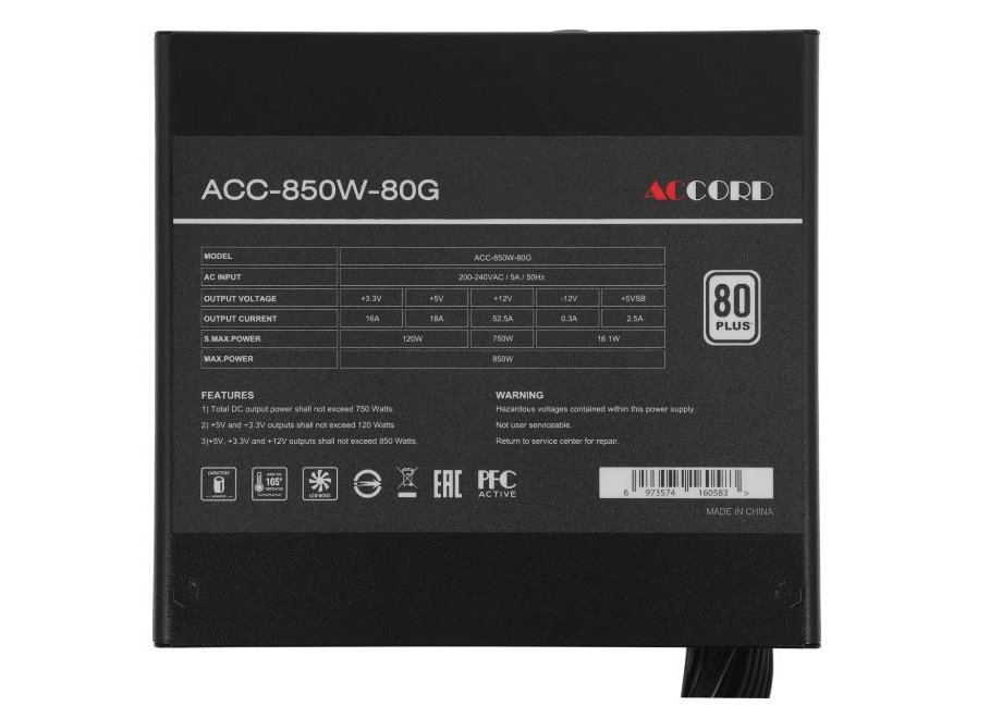 | Описание | Бренд: ACCORD, Модель: ACC-850-80G, Форм-фактор: ATX, Версия ATX: 12V v2.4, Активный PFC: есть, Сертифицирован в стандарте: 80 PLUS GOLD, Питание материнской платы: 20+4 pin, Питание видеокарты: 4х(6+2) pin, Разъемы Peripheral (Molex): 2 шт, Разъемы SATA: 6 шт, Размер вентилятора(ов): 120мм, Количество вентиляторов: один |