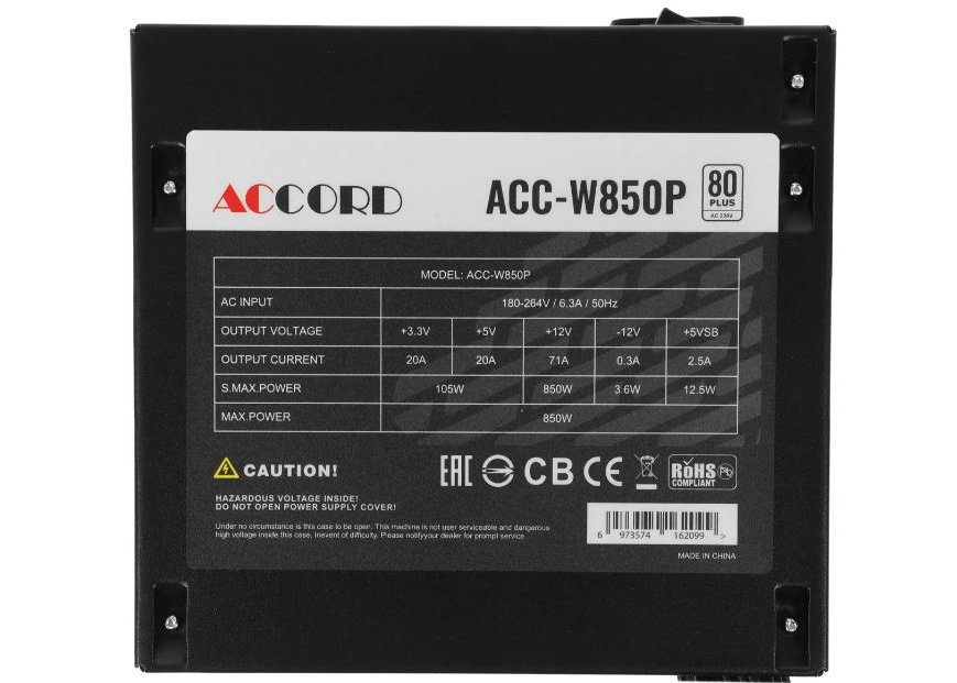 | Описание | Бренд: ACCORD, Модель: ACC-W850P, Форм-фактор: ATX, Версия ATX: 12V v2.4, Производительность (КПД): 82 %, Сертифицирован в стандарте: 80 PLUS WHITE, Тип системы охлаждения: активная, Наработка на отказ (MTBF): 20000 ч, Минимальное входное напряжение: 180 В, Максимальное входное напряжение: 264 В, Цвет: черный, Питание процессора: 2x(4+4) pin, Питание материнской платы: 20+4 pin, Питание видеокарты: 4х(6+2) pin, Разъемы Peripheral (Molex): 2 шт, Разъемы SATA: 6 шт, Размер вентилятора(ов): 120мм, Количество вентиляторов: один, Подшипник вентилятора(ов): гидродинамический, Сетевой кабель: в комплекте, Защита от коротких замыканий (SCP): есть, Защита от повышения напряжения (OVP): Защита от повышения напряжения (OVP): есть, Защита от понижения напряжения (UVP): есть, Защита от перегрузки любого из выходов БП (OCP): есть |