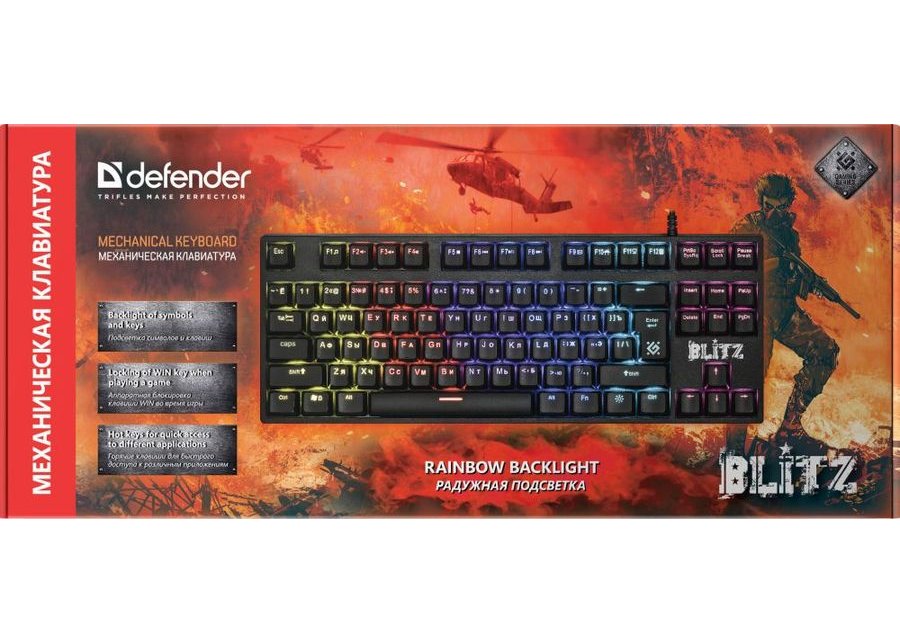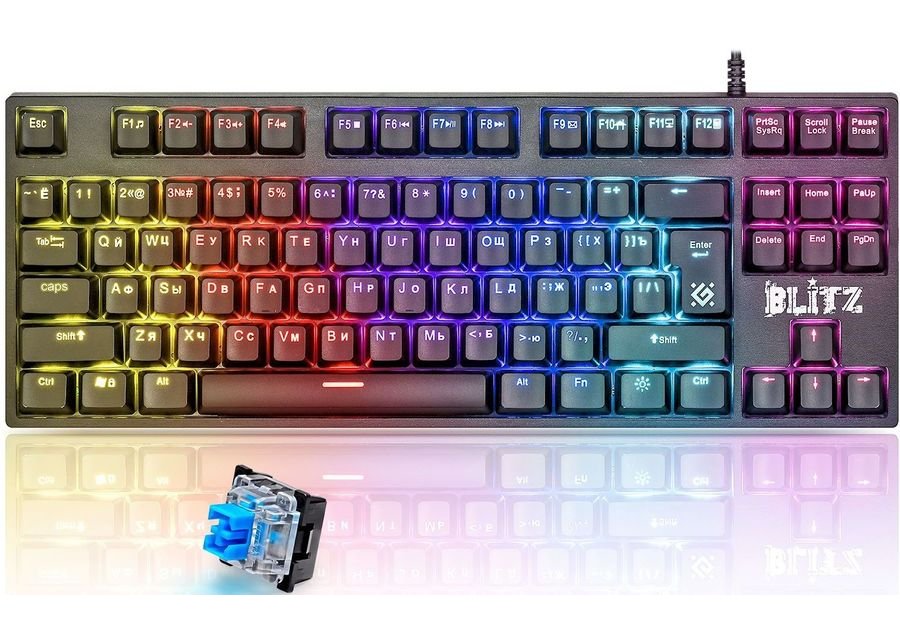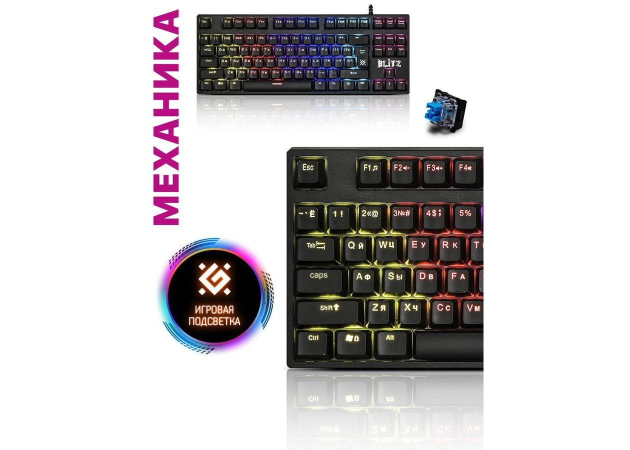 | Клавиатура | Механическая: да, Тип механических переключателей: Blue, Дизайн клавиш: квадратные, Цвет английских букв: белый, Цвет русских букв: белый, Цифровой блок: отсутствует, Материал корпуса: пластик |