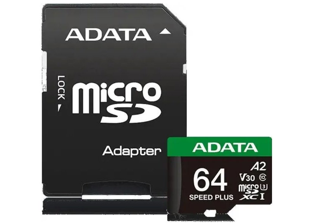 Карта памяти MicroSDXC ADATA 64 Гб Speed Plus (UD64GUI3V30A2SP-RA1) Class 10 UHS-I U3, переходник SD