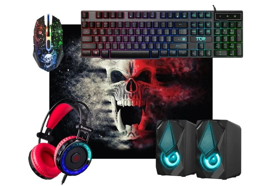 Комплект Defender Tor MHP-127 набор игровой клавиатура+мышь+коврик+гарнитура+колонки, подсветка, USB черный