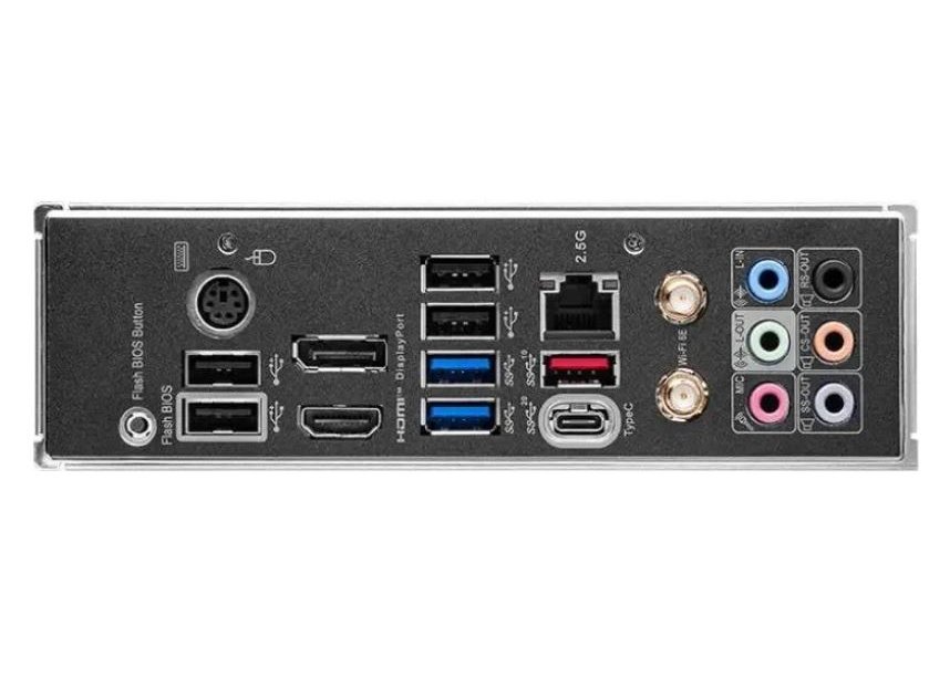 | Внешние разъемы | 2 x SMA (для антенны Wi-Fi), 2 x USB 3.2 Gen 1 5Gbps Type-A, 4 x USB 2.0 Type-A, DisplayPort, HDMI, LAN RJ-45, PS/2 (клавиатура/мышь), 1 x USB 3.2 Gen 2x2 20Gbps Type-C, 1 x USB 3.2 Gen 2 10Gbps Type-A, 6 x Audio Connectors |