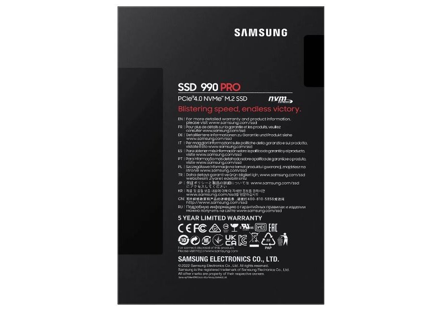 | Прочее | Бренд: SAMSUNG, Для ПК/ноутбука: ДА, Тип жесткого диска: SSD, Время наработки на отказ: 1500000 ч, Тип памяти NAND: 3D TLC, Поддержка NVMe: есть, Поддержка TRIM: есть, Ключ M.2 разъема: M, Ресурс TBW: 2400 ТБ, Потребляемая мощность: 8.5 Вт, Потребляемая мощность в режиме ожидания: 0.055 Вт, Ударостойкость при работе: 1500 G, Ударостойкость при хранении: 1500 G |