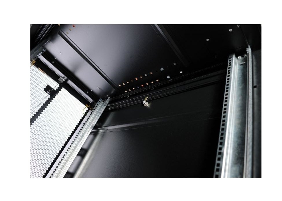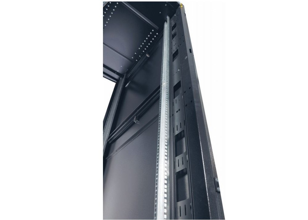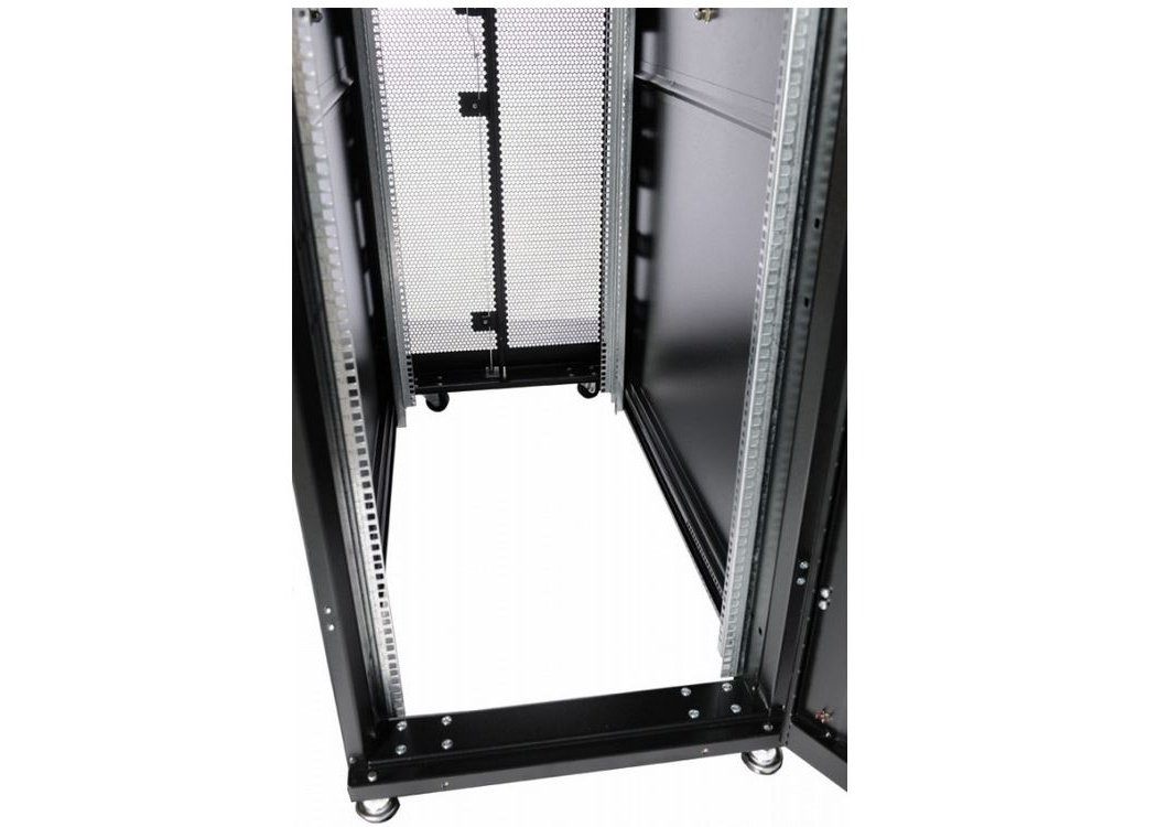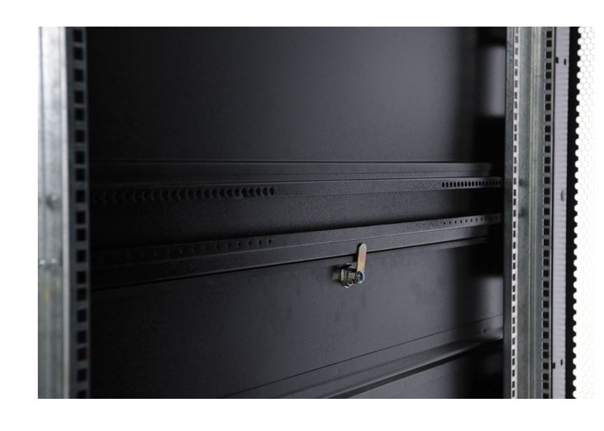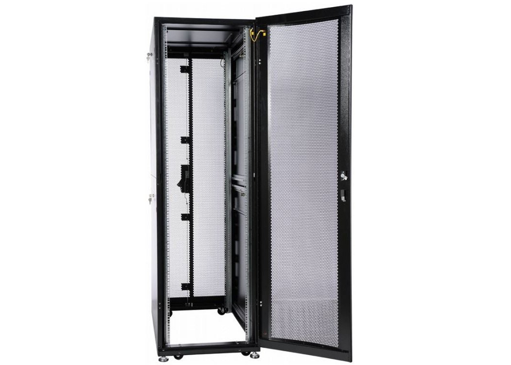 | Шкаф телекоммуникационный ШТК-СП предназначен для размещения электронного и электротехнического оборудования, аппаратуры телекоммуникационных систем, передачи и хранения информации в закрытых помещениях. Вид климатического исполнения О4.2 по ГОСТ 15150 с предельными рабочими температурами воздуха при эксплуатации от +1 до +45 °С и относительной влажности не более 80 % при +20 °С. Шкаф поставляется в полностью собранном виде с установленными металлическими дверями, задней и боковыми стенками, имеет степень защиты IP20. Предусмотрена возможность установки панелей системы несущих конструкций 482,6 мм по ГОСТ 28601.1 (19” по МЭК 297). Шкаф имеет две массивные сварные рамы, соединённые комплектом швеллеров, что обеспечивает повышенную жёсткость конструкции. В зависимости от комплектации шкаф может поставляться с передней и задней перфорированными дверьми (одностворчатыми или двухстворчатыми), усиленными боковыми стенками. Двери фиксируются замками с ручкой. Возможна установка двери как с левой, так и с правой стороны. Конструкция дверей допускает их быстрое снятие и установку без инструментов. Верхние и нижние боковые проёмы закрываются отдельными стенками. Стенки фиксируются точечными замками. Крыша имеет заглушённые отверстия под кабельные вводы. Также в крыше предусмотрены отверстия для крепления кабельных каналов фиксатором КГЛ (в комплект поставки не входит). Открытое основание шкафа обеспечивает свободный доступ к коммутациям в подготовленном помещении. В нижней части шкафа возможна установка панелей различного назначения (например, фальшпол ОС-ШТК-СП-х). Кроме того, в основании шкафа установлены регулируемые опоры и транспортировочные ролики для перемещения шкафа без оборудования. Предусмотрено крепление шкафа к полу (кронштейны в базовой поставке крепят шкаф к деревянному поддону). Доступ для монтажа, коммутации и обслуживания оборудования возможен с четырёх сторон: через боковые стенки, переднюю и заднюю двери. В базовой комплектации шкаф имеет 4 оцинкованные вертикальные направляющие, регулируемые по глубине. Предусмотрена система заземления (провода для заземления всех деталей шкафа входят в комплект поставки). Тыльная сторона шкафа стандартно комплектуется вертикальными кабельными органайзерами шириной 116 мм, перфорированными для удобства размещения блоков розеточных (PDU), укладки и фиксации кабелей. Органайзеры имеют систему отверстий для быстрых установки и снятия блоков и оборудования различных типов без инструментов. |