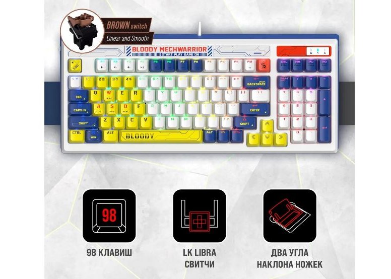 | Клавиатура | Механическая: да, Тип механических переключателей: LK Libra, Клавиатура с русскими буквами: ДА, Количество клавиш: 98, Дизайн клавиш: квадратные, Цвет английских букв: многоцветный, Цвет русских букв: прозрачный, Время отклика: 0.2 мс |