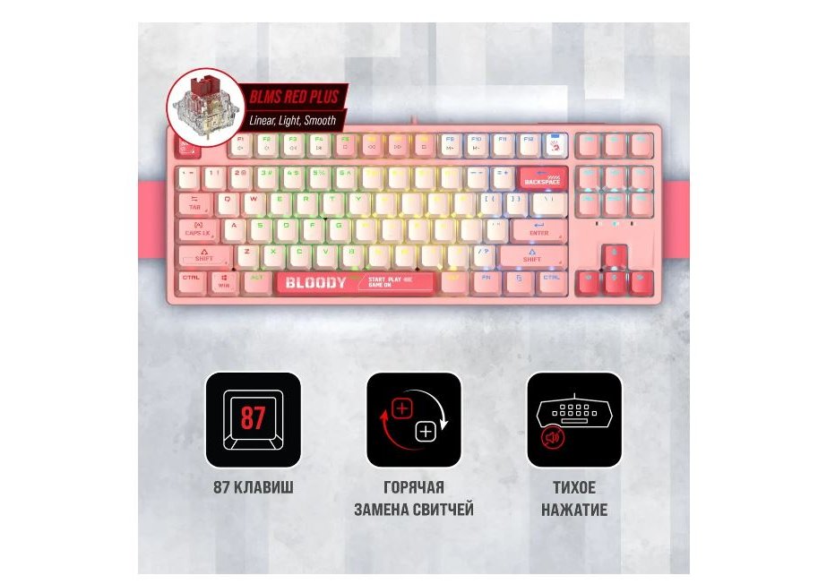 | Клавиатура | Механическая: да, Тип механических переключателей: BLMS Red Plus, Клавиатура с русскими буквами: ДА, Количество клавиш: 87, Дизайн клавиш: квадратные, Цвет английских букв: прозрачный, Цвет русских букв: прозрачный, Цифровой блок: отсутствует, Материал корпуса: пластик |
