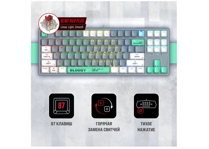 | Клавиатура | Механическая: да, Тип механических переключателей: BLMS Red Plus, Клавиатура с русскими буквами: ДА, Количество клавиш: 87, Дизайн клавиш: квадратные, Цвет английских букв: прозрачный, Цвет русских букв: прозрачный, Цифровой блок: отсутствует, Материал корпуса: пластик |