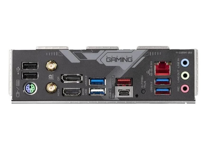 | Внешние разъемы | 2 разъема SMA для подключения антенн (2T2R). Кнопка Q-Flash Plus. 1 порт DisplayPort. 1 порт HDMI. 1 порт USB Type-C®, шинный интерфейс USB 3.2 Gen 2. 1 порт USB 3.2 Gen 2 (Type-A разъем красного цвета). 3 порта USB 3.2 Gen 1. 3 порта USB 2.0/1.1. 1 сетевая розетка LAN RJ-45. 3 разъема аудиоподсистемы. |