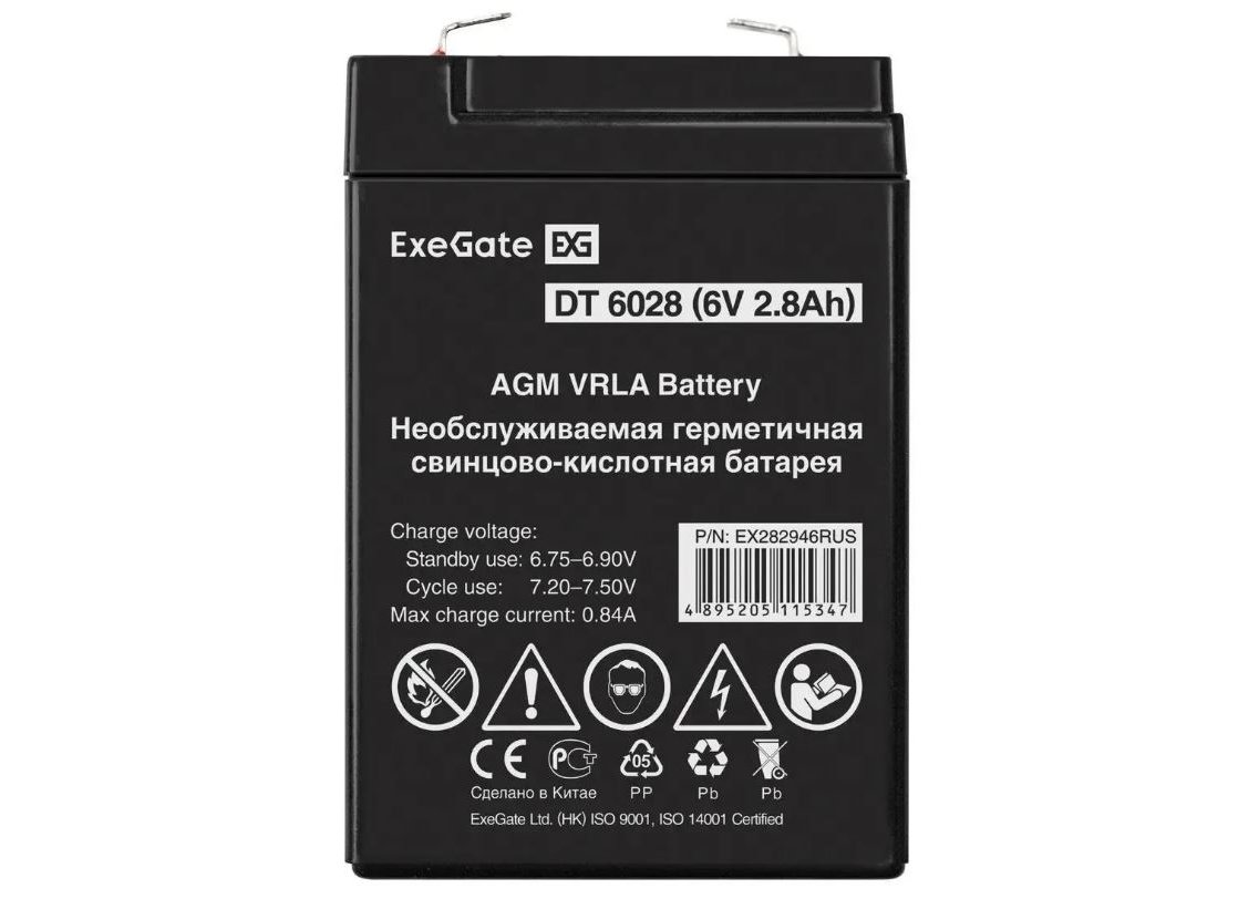 | Бренд: EXEGATE. Модель: EX282946. Напряжение питания: 6 В. Емкость: 2.8 Ач. Клеммы: F1. Описание: Свинцово-кислотные необслуживаемые аккумуляторы ExeGate серии DT изготовлены по технологии AGM. Особенности: Корпус выполнен из пластика, не поддерживающего горение. Система внутренней рекомбинации газа, не требует долива воды. Эксплуатация допустима в любом положении, кроме перевернутого верх дном. Легированные кальцием свинцовые пластины обеспечивают высокую плотность энергии. Материал корпуса: ABS. Размеры (ШхВхГ): 33 х 103 х 66 мм. Габариты упаковки (ед) ДхШхВ: 0.065x0.03x0.1 м. Вес товара: 0.53 кг. Вес упаковки (ед): 0.56 кг |