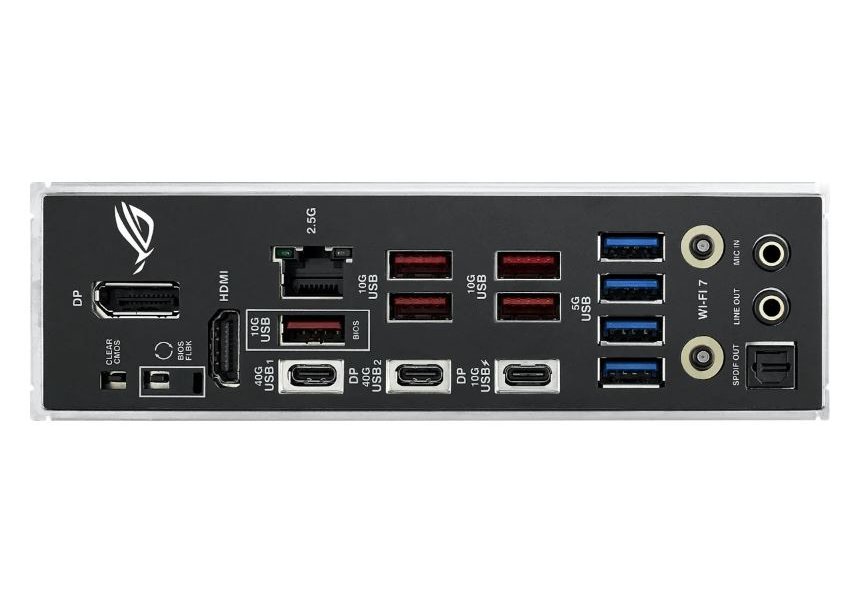 | Внешние разъемы | 2 х USB4 ® (40 Гбит/с) порты (2 порта USB Type-C ® с режимом DP Alt), 6 портов USB 10 Гбит/с (5 портов типа A + 1 порт USB типа C) ® с быстрой зарядкой PD до 30 Вт), 4 порта USB 5 Гбит/с (4 порта Type-A), 1 порт Display Port, 1 порт HDMI™, 1 модуль Wi-Fi, 1 х Интел ® 2,5 ГБ Ethernet, 2 аудиоразъема, 1 оптический выходной порт S/PDIF, 1 кнопка BIOS FlashBack™, 1 кнопка очистки CMOS. |