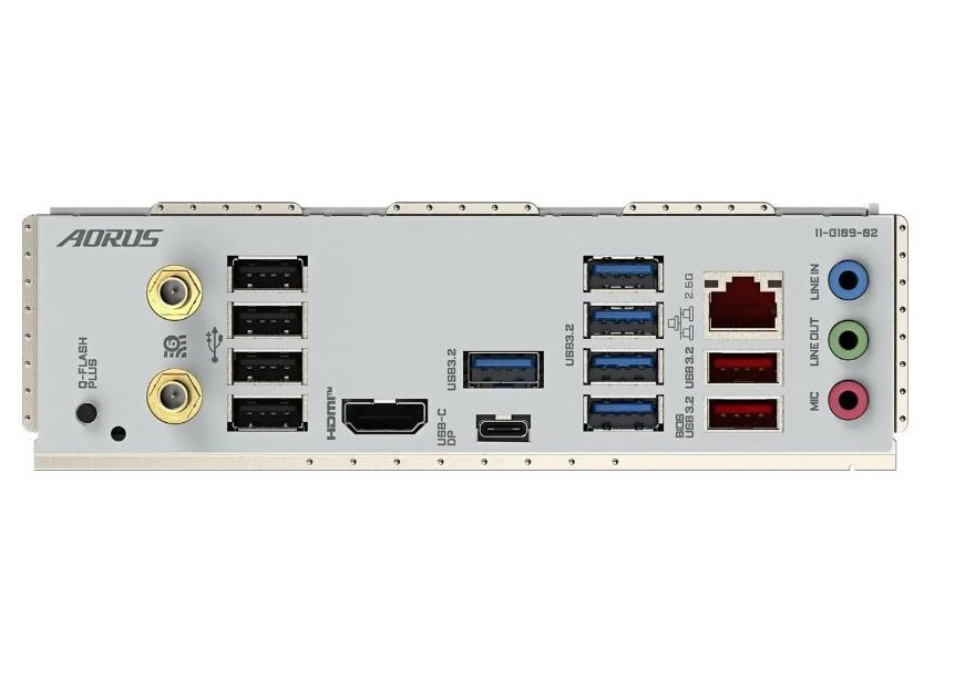 | Внешние разъемы | Кнопка Q-Flash Plus, 2 разъема для подключения WiFi антенны (2T2R), 1 порт HDMI, 1 порт USB Type-C®, шинный интерфейс USB 3.2 Gen 2, 2 порта USB 3.2 Gen 2 (исполнение Type-A, разъемы красного цвета), 5 портов USB 3.2 Gen 1, 4 порта USB 2.0/1.1, 1 сетевая розетка LAN RJ-45, 3 разъема аудиоподсистемы. |