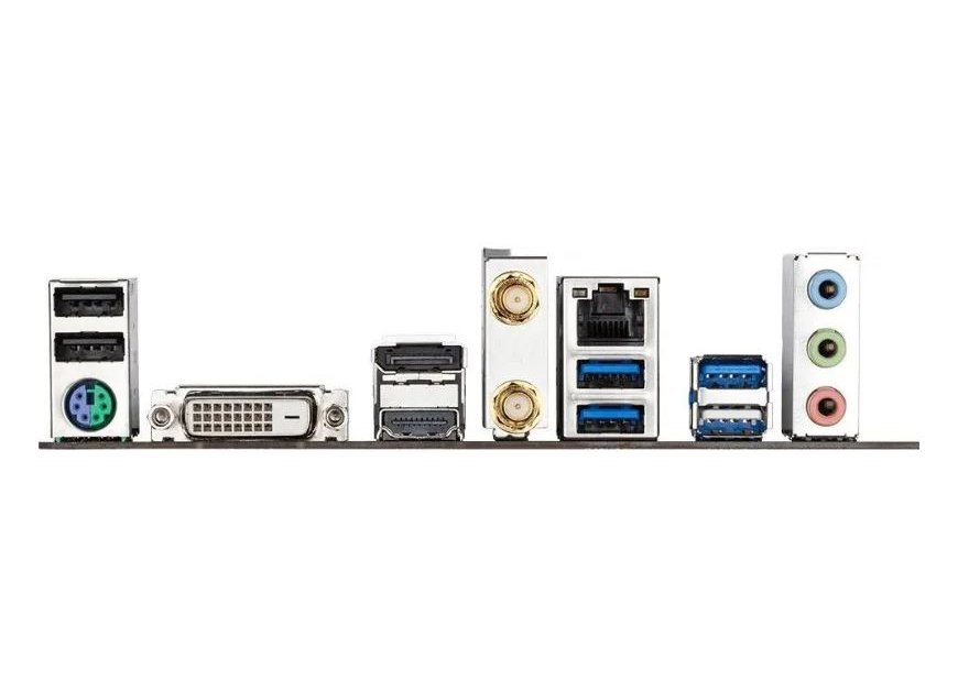 | Внешние разъемы | 1 порт PS/2 для подключения клавиатуры и мыши, 1 порт DVI-D, 1 порт DisplayPort, 1 порт HDMI, 2 разъема для SMA-антенны (1T1R), 4 порта USB 3.2 Gen 1, 2 порта USB 2.0/1.1, 1 сетевая розетка LAN RJ-45, 3 разъема аудиоподсистемы |
