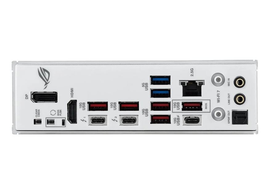 | Внешние разъемы | 2 порта Thunderbolt™ 4 (2 порта USB Type-C ® ), 6 портов USB 10 Гбит/с (5 портов Type-A + 1 порт USB Type-C) ® с быстрой зарядкой PD/PPD мощностью до 30 Вт), 2 порта USB 5 Гбит/с (2 порта Type-A), 1 х DisplayPort, 1 порт HDMI™, 1 модуль Wi-Fi, 1 х Интел ® Порт Ethernet 2,5 Гбит, 2 аудиоразъема, 1 x оптический выходной порт S/PDIF, 1 кнопка BIOS FlashBack™, 1 x кнопка очистки CMOS. |