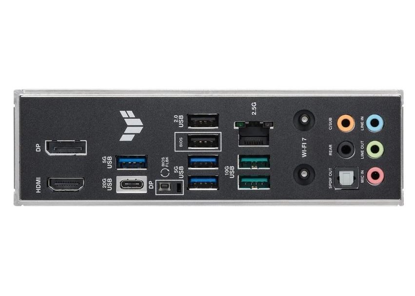 | Внешние разъемы | 1 порт USB 20 Гбит/с (1 порт USB Type-C) ® с режимом DP Alt), 2 порта USB 10 Гбит/с (2 порта USB Type-A), 3 порта USB 5 Гбит/с (3 порта Type-A), 2 порта USB 2.0 (2 порта Type-A), 1 х DisplayPort, 1 порт HDMI™, 1 модуль Wi-Fi, 1 порт Realtek 2.5Gb Ethernet, 5 аудиоразъемов, 1 x оптический выходной порт S/PDIF, 1 кнопка BIOS FlashBack™. |