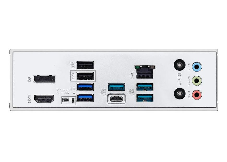 | Внешние разъемы | 1 порт USB 10 Гбит/с (1 порт USB Type-C®), 3 порта USB 10 Гбит/с (3 порта Type-A), 2 порта USB 5 Гбит/с (2 порта Type-A), 2 порта USB 2.0 (2 порта Type-A), 1 х DisplayPort, 1 порт HDMI™, 1 модуль Wi-Fi, 1 порт Realtek 2.5Gb Ethernet, 3 аудиоразъема, 1 кнопка BIOS FlashBack™ |