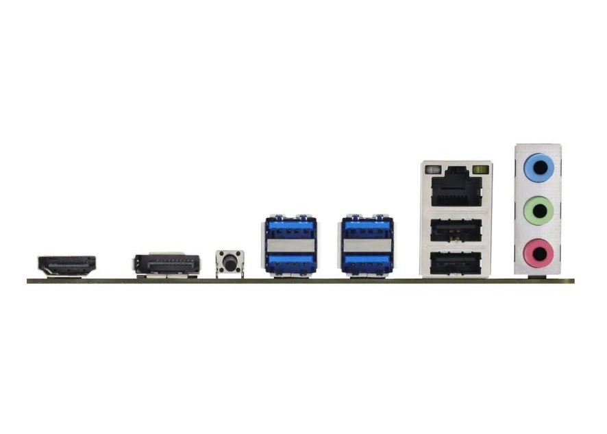| Внешние разъемы | 1 x кнопка SMART BIOS UPDATE, 1 порт HDMI® (HDMI®1.4), 1 x DP-порт (DP1.2), 4 порта USB 3.2 (Gen1) Type-A, 2 порта USB 2.0 Type-A, 1 x Giga LAN port, 3 аудиоразъема |