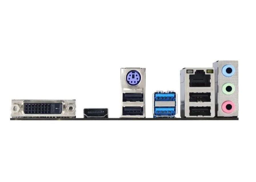 | Внешние разъемы | 1 порт PS/2 для клавиатуры/мыши, 1 порт HDMI®, 1 порт DVI, 2 порта USB 3.2 (Gen1), 4 порта USB 2.0, 1 порт LAN, 3 аудиоразъема. |