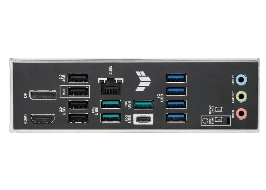 | Внешние разъемы | 1 порт USB 20 Гбит/с (1 порт USB Type-C® ), 3 порта USB 10 Гбит/с (3 порта Type-A), 4 порта USB 5 Гбит/с (4 порта Type-A), 4 порта USB 2.0 (4 порта Type-A), 1 порт DisplayPort, 1 порт HDMI™, 1 порт Realtek 2.5 Гбит Ethernet, 3 аудиоразъема, 1 кнопка BIOS FlashBack™, 1 кнопка очистки CMOS. |