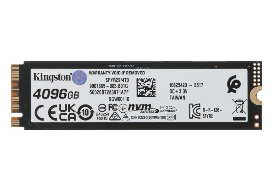 | Прочее | Бренд: KINGSTON, Предназначен: для ПК, для ноутбука, Тип жесткого диска: SSD, Время наработки на отказ: 2000000 ч, Контроллер NAND: Silicon Motion SM2508, Тип памяти NAND: TLC, Структура памяти NAND: 3D, Поддержка NVMe: есть, Ключ M.2 разъема: M, Ресурс TBW: 4000 ТБ, Потребляемая мощность: 9.5 Вт, Особенности: Поддержка DirectStorage, Ударостойкость при работе: 2.17 G, Ударостойкость при хранении: 20 G, Для геймеров: ДА |