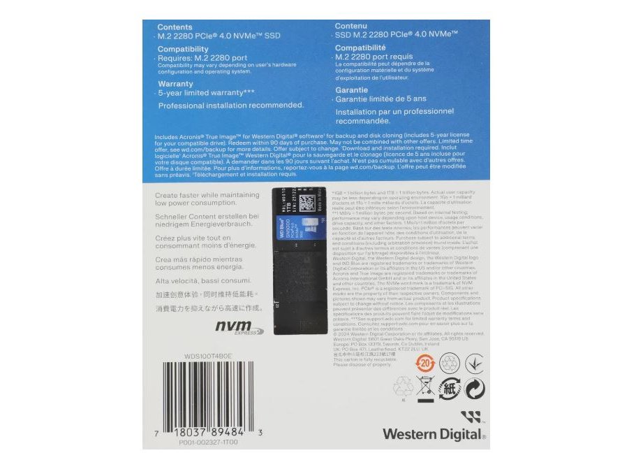 | Прочее | Бренд: WD, Предназначен: для ПК, для ноутбука, Тип жесткого диска: SSD, Время наработки на отказ: 1500000 ч, Тип памяти NAND: TLC, Структура памяти NAND: 3D, Поддержка NVMe: есть, Ключ M.2 разъема: M, Ресурс TBW: 600 ТБ, Потребляемая мощность: 6.3 Вт, Потребляемая мощность в режиме ожидания: 0.07 Вт, Ударостойкость при работе: 1500 G, Ударостойкость при хранении: 1500 G |