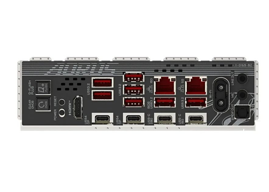 | Внешние разъемы | 1 кнопка Q-Flash Plus, 1 кнопка Clear CMOS, 1 кнопка сброса, 1 кнопка питания, 1 порт HDMI, 2 порта USB4® USB Type-C® (DisplayPorts), 1 порт USB Type-C® с поддержкой USB 3.2 Gen 2, 1 порт USB Type-C® с поддержкой USB 3.2 Gen 2x2, 7 портов USB 3.2 Gen 2 Type-A (красные), 2 порта RJ-45, 2 разъема для антенн (2T2R), 2 аудиоразъема, 1 оптический разъем S/PDIF Out. |
