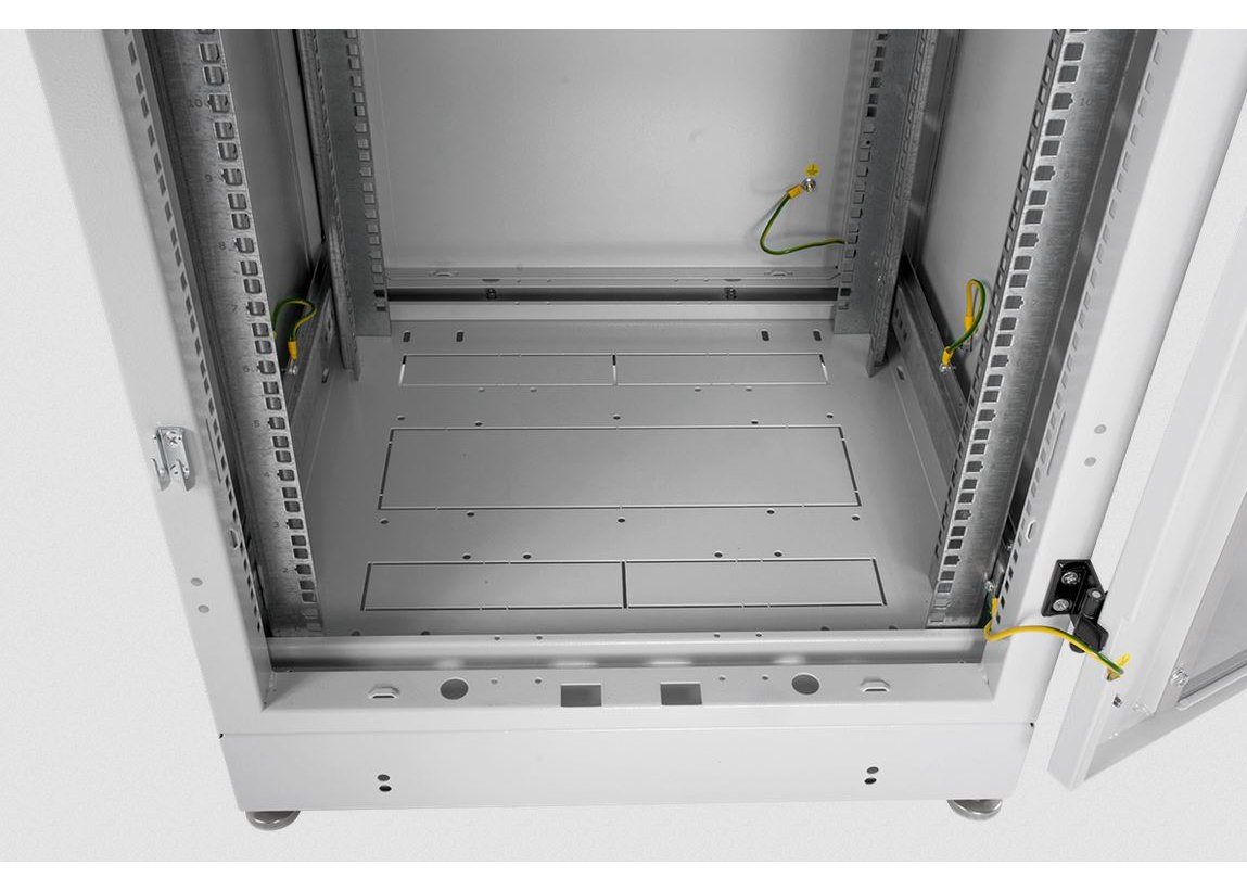 | Шкаф телекоммуникационный ШТК-М предназначен для размещения телекоммуникационного оборудования, организации центров хранения и обработки данных. Класс защиты – IP20. Шкаф имеет разборную каркасную конструкцию. Лёгок в сборке. Состоит из основания, крыши и двух сварных рам, соединённых комплектом швеллеров. На боковых элементах рамы выполнена дополнительная перфорация под закладные гайки. Стандартно шкафы комплектуются задней металлической стенкой и тремя видами дверей: цельнометаллической, с тонированным ударопрочным стеклом или дверью с перфорацией. Возможна комплектация двумя дверьми, исключающая заднюю стенку. В шкафах 18–36U дверь фиксируется усиленным точечным замком, в 42–48U – ригельным. Двери имеют как правую, так и левую навеску, угол открытия 180 °. Усиленная конструкция допускает распределённую статическую нагрузку до 1200 кг. В крышу и основание шкафов глубиной 600 мм возможна установка до трёх вентиляторных модулей серии R-FAN, шкафов глубиной 800 мм – четырёх, а шкафов глубиной 1000 и 1200 мм – шести. Также в этих элементах имеется дополнительная перфорация и отверстия под кабельный ввод 212 ? 110 мм и/или 422 ? 55 мм с возможностью установки щёточных вводов серии КВ-Щ. Предусмотрена установка винтовых опор (ножек) позволяющих компенсировать неровности пола (входят в комплект поставки). Возможна установка поворотных роликов различной нагрузочной способности (в комплект поставки не входят). Доступ для монтажа, коммутации и обслуживания оборудования возможен с четырёх сторон: через боковые легкосъёмные стенки, переднюю и заднюю двери. В базовой комплектации шкаф имеет четыре оцинкованные вертикальные направляющие, регулируемые по глубине. Предусмотрена система заземления (провода для заземления всех деталей шкафа входят в комплект поставки). Покрытие – краска полимерно-порошковая, шагрень с предварительным фосфатированием. Шкафы поставляются в разобранном виде и компактно упаковываются в три транспортных места. Обновлённая конструкция • Новая конструкция рам с полузамкнутым профилем позволила увеличить несущую способность шкафа до 1200 кг. Также благодаря ей шкафы соединяются между собой без дополнительных крепёжных элементов. Внутренняя поверхность рам по вертикали получила перфорацию, создающую дополнительное монтажное пространство для установки органайзеров, шин заземления и прочих аксессуаров. • Габаритная ширина шкафов теперь составляет 598 и 798 мм. Расширен перечень доступных типоразмеров шкафа по глубине до 1200 мм. Эти изменения позволяют использовать ШТК-М в качестве серверных шкафов при построении ЦОД. • Основание изделия выведено в размер с рамой – каркас шкафа обрёл монолитную целостность. • Горизонтальные монтажные швеллеры унифицированы. В комплекте шкафа поставляются швеллеры единого типа, что упрощает сборку. • Вертикальные юнитовые направляющие получили опору на основание, благодаря чему повысилась их несущая способность. Вертикальные юнитовые направляющие для шкафов шириной 800 мм стали цельными, без дополнительных проставок, – их монтаж стал ещё удобнее. Также в них предусмотрены окна под установку аксессуаров, создающие дополнительное монтажное пространство. • Применение запрессованных резьбовых элементов существенно упростило сборку каркаса. • Установка стенок в шкаф теперь не тр