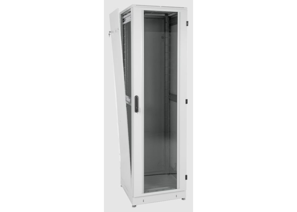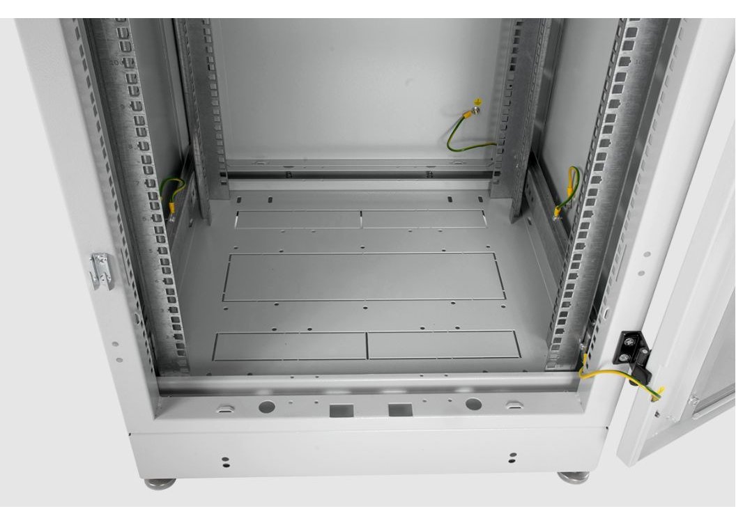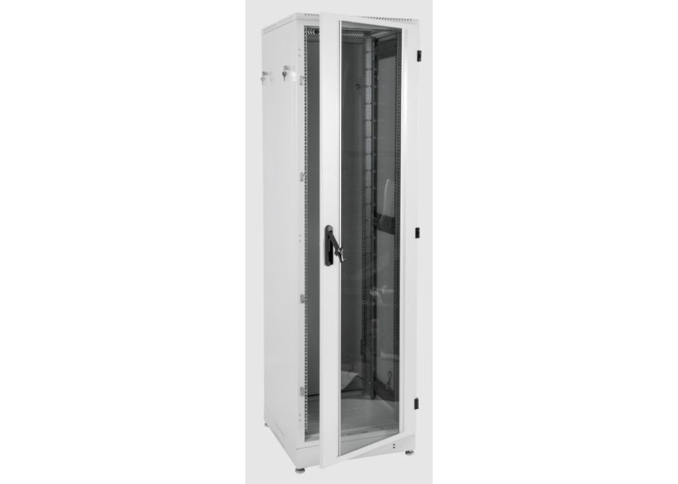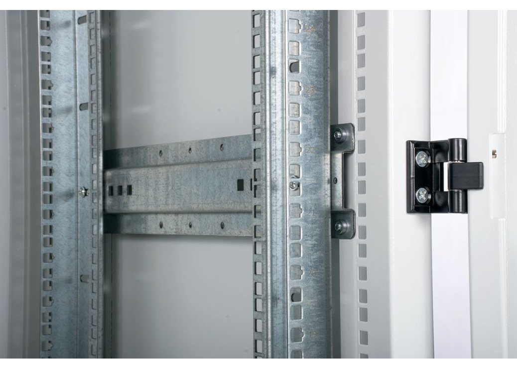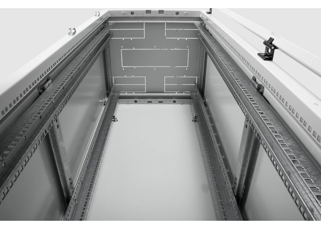 | Шкаф телекоммуникационный ШТК-М предназначен для размещения телекоммуникационного оборудования, организации центров хранения и обработки данных. Класс защиты – IP20. Шкаф имеет разборную каркасную конструкцию. Лёгок в сборке. Состоит из основания, крыши и двух сварных рам, соединённых комплектом швеллеров. На боковых элементах рамы выполнена дополнительная перфорация под закладные гайки. Стандартно шкафы комплектуются задней металлической стенкой и тремя видами дверей: цельнометаллической, с тонированным ударопрочным стеклом или дверью с перфорацией. Возможна комплектация двумя дверьми, исключающая заднюю стенку. В шкафах 18–36U дверь фиксируется усиленным точечным замком, в 42–48U – ригельным. Двери имеют как правую, так и левую навеску, угол открытия 180 °. Усиленная конструкция допускает распределённую статическую нагрузку до 1200 кг. В крышу и основание шкафов глубиной 600 мм возможна установка до трёх вентиляторных модулей серии R-FAN, шкафов глубиной 800 мм – четырёх, а шкафов глубиной 1000 и 1200 мм – шести. Также в этих элементах имеется дополнительная перфорация и отверстия под кабельный ввод 212 ? 110 мм и/или 422 ? 55 мм с возможностью установки щёточных вводов серии КВ-Щ. Предусмотрена установка винтовых опор (ножек) позволяющих компенсировать неровности пола (входят в комплект поставки). Возможна установка поворотных роликов различной нагрузочной способности (в комплект поставки не входят). Доступ для монтажа, коммутации и обслуживания оборудования возможен с четырёх сторон: через боковые легкосъёмные стенки, переднюю и заднюю двери. В базовой комплектации шкаф имеет четыре оцинкованные вертикальные направляющие, регулируемые по глубине. Предусмотрена система заземления (провода для заземления всех деталей шкафа входят в комплект поставки). Покрытие – краска полимерно-порошковая, шагрень с предварительным фосфатированием. Шкафы поставляются в разобранном виде и компактно упаковываются в три транспортных места. Обновлённая конструкция • Новая конструкция рам с полузамкнутым профилем позволила увеличить несущую способность шкафа до 1200 кг. Также благодаря ей шкафы соединяются между собой без дополнительных крепёжных элементов. Внутренняя поверхность рам по вертикали получила перфорацию, создающую дополнительное монтажное пространство для установки органайзеров, шин заземления и прочих аксессуаров. • Габаритная ширина шкафов теперь составляет 598 и 798 мм. Расширен перечень доступных типоразмеров шкафа по глубине до 1200 мм. Эти изменения позволяют использовать ШТК-М в качестве серверных шкафов при построении ЦОД. • Основание изделия выведено в размер с рамой – каркас шкафа обрёл монолитную целостность. • Горизонтальные монтажные швеллеры унифицированы. В комплекте шкафа поставляются швеллеры единого типа, что упрощает сборку. • Вертикальные юнитовые направляющие получили опору на основание, благодаря чему повысилась их несущая способность. Вертикальные юнитовые направляющие для шкафов шириной 800 мм стали цельными, без дополнительных проставок, – их монтаж стал ещё удобнее. Также в них предусмотрены окна под установку аксессуаров, создающие дополнительное монтажное пространство. • Применение запрессованных резьбовых элементов существенно упростило сборку каркаса. • Установка стенок в шкаф теперь не тр