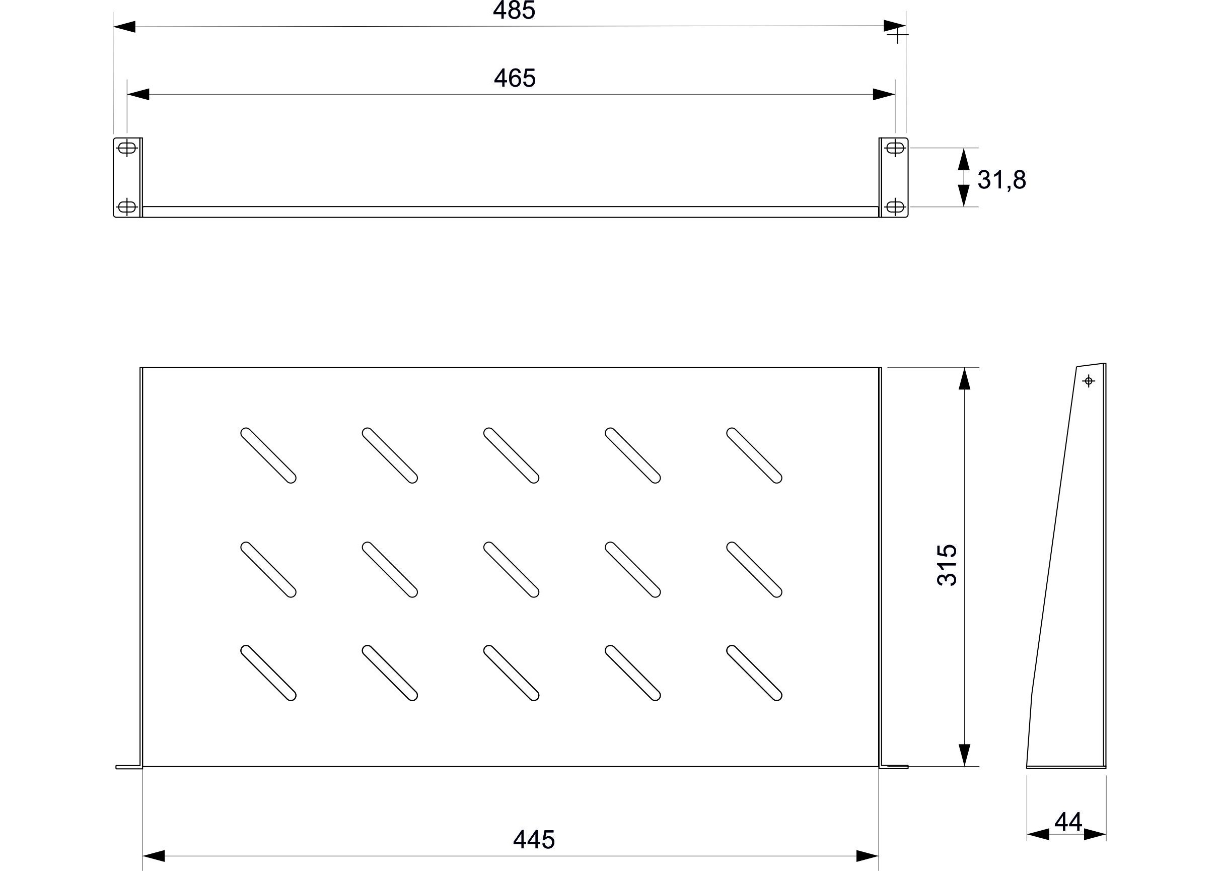 | Консольная полка 1U переднего крепления на направляющие шкафов и стоек 19”. Предназначена для размещения малогабаритного оборудования, не имеющего стандартного 19” крепления. Полка имеет перфорацию, позволяющую охлаждать технологическое оборудование. Максимально разрешенная нагрузка -15 кг. Покрытие – порошковая ударопрочная краска, черная (RAL9004). Толщина стали составляет 1,3 мм. Установка консольной полки производится путем крепления на направляющие 19” с помощью стандартного крепежа – квадратных гаек, винтов М6 и пластиковых шайб. |