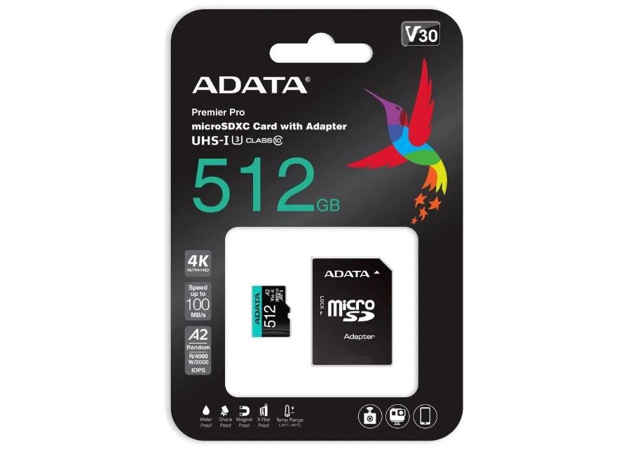 | Брэнд: A-DATA. Модель: AUSDX512GUI3V30SA2-RA1. Подтип: microSDXC. Емкость: 512 ГБ. Классификация по скорости записи: Class 10. Класс скорости: UHS-I U3. Скорость чтения, макс.100 МБ/с. Скорость записи, макс.85 МБ/с .Класс скорости APC: A2. Класс скорости VSC: V30. Водостойкая: да. Термостойкая: да. Ударопрочная: да. Стойкая к рентгеновскому излучению: да. Переходник SD. Вес упаковки (ед): 0.026 кг |
