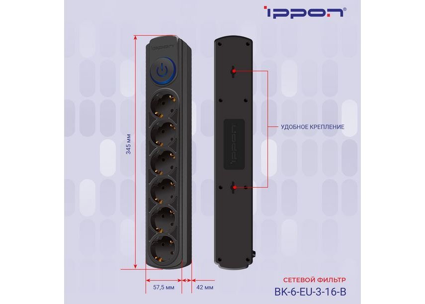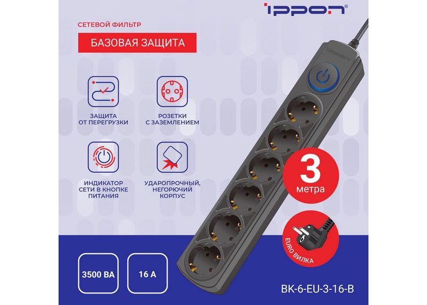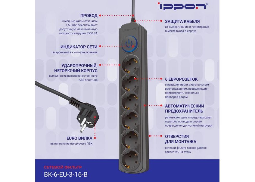 | Кол-во розеток | 6 заземлённых розеток (евростандарт) |